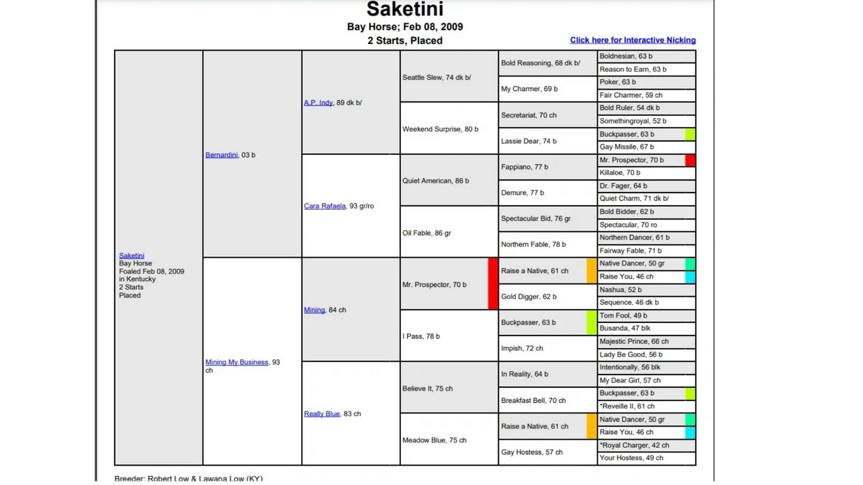 Just as important, Saketini comes from an elite female family. At the time of Saketini's conception, Bernardini stood for an impressive $100,000 and received only the best mares in his book. Saketini's damline is full of "black type" stakes horses; his half-sister, Real Cozzy by Cozzene, was a G2 winner and placed second in the Kentucky Oaks, and he has other half-sisters who are stakes producers. Saketini's second dam, Really Blue, is the dam of Real Quiet-- the 1998 Derby and Preakness winner who missed the triple crown by a nose. (Real Quiet, by Quiet American...who is Bernardini's damsire). Fourth dam Gay Hostess is the dam of legacy sire Majestic Prince. Clearly an enormous amount of athletic success is concentrated in this female line, and makes Saketini stand far above other Thoroughbred stallions available to sport horse mares.